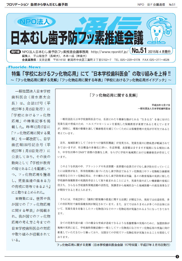一般社団法人日本学校歯科医会会誌117号(平成27年 3 月15日発行)に、「学校におけるフッ化物応用」の特集記事が掲載されました。昨年12月17日に、「フッ化物応用に関する見解」が一部改訂され、日学歯広報150号記念号(平成27年 1 月10日発行)に公表されていました。