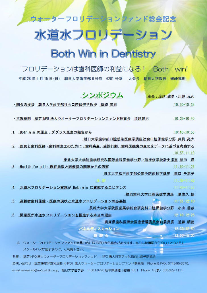 共催:認定 NPO法人ウォータフロリデションファンド、, NPO法人日本むし歯予防フッ素推進会議