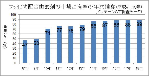 フッ化物配合歯磨剤のシェアが89%(平成18年)になりました 。
