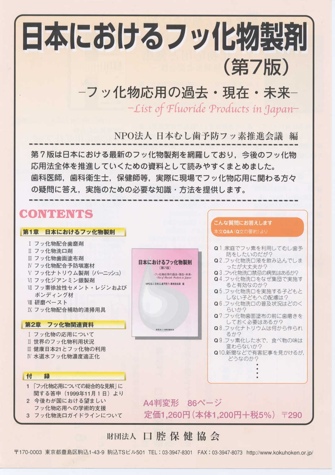| 申込先: @会員は下記にお願いいたします。(値引特典があります) 「日本におけるフッ化物製剤(第7版)」のグループ購入(5册以上の場合)の申込先について(メールの場合)、下記のどちらかのメールにお願い致します。 田浦先生 ktaura@mail.tains.tohoku.ac.jp 木本先生 kimotokz@kdcnet.ac.jp A一般の方 財団法人 口腔保健協会 〒170-0003 東京都豊島区駒込1-43-9 駒込TSビル501 TEL 03-3947-8301 FAX 03-3947-8073 http:/www.kokuhoken.or.jp |