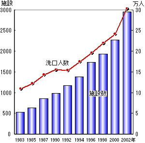 (2)集団・家庭でのフッ素利用方法 フッ化物洗口法(フッ素洗口) フッ化ナトリウム溶液による約1分間洗口する方法です。4歳からの実施により永久歯で50〜60%のむし歯予防効果があります。 園や学校など集団で実施するフッ化物洗口法は、個人でする場合と比較して (1) その施設内のほぼ全員の子供たちに、むし歯予防の効果が表れます。 (2) 歯科医や園の先生によるのではなく、子供たちが自分で行ないます。 (3) 施設内であれば、忘れることがなく、確実な管理ができます。 というメリットがあります。 集団で実施するフッ化物洗口法は、下の図のように日本で約3000施設、30万人の子供が実施していますが、これは必要とされる全小児人口の2%程度であり、今後も普及が期待されています。