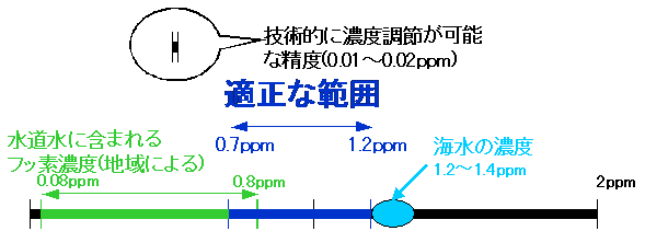 地域・集団で利用する方法は、実施対象者も多いために、安く、安全に、効果的に虫歯予防をすることができます。 (1) 地域で利用する方法 水道水フッ化物濃度適正化(WF:水道水フロリデーション) 水道水フッ化物濃度適正化とは、水道水中に含まれるフッ素の濃度(現在の日本では通常の水道水中には、自然の状態で0.08ppm〜0.8ppm*含まれている)をむし歯予防のために適正な濃度に調節する方法です。わが国での適正濃度は地域によって約0.7ppm〜1.2ppmであり、普通のお茶のフッ素濃度より少し高く、自然の海水より低い濃度です。現在の水道技術では、蛇口からの水道水のフッ素濃度を0.01ppm〜0.02ppmの精度で調節することができます。