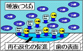 フッ素のむし歯予防効果は (1)再石灰化の促進、(2)歯の質の強化、(3)むし歯菌の酵素作用の抑制の3つに分けられます。 (1)再石灰化の促進 テレビCMでおなじみの再石灰化。歯は、むし歯菌が出す酸による脱灰によって歯の表面が溶かされ、やがてむし歯になります。しかし、唾液や歯垢にフッ素があると、その溶かされた歯の表面は再び修復されて、もとの健康な歯を取り戻すことができます。その作用を再石灰化と呼び、フッ素は、その再石灰化作用を速め、強化する働きがあるのです。