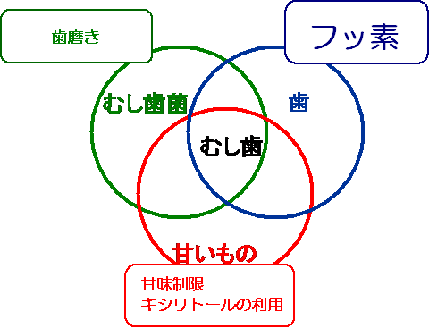 下の図のようにむし歯の原因は、むし歯菌、甘いもの、歯の3つの要因に分類されて説明されています。今までは、そのむし歯菌のつくるプラーク(歯垢)に対する歯磨きの奨励と、甘いものの対策として甘味制限を行ってきました。