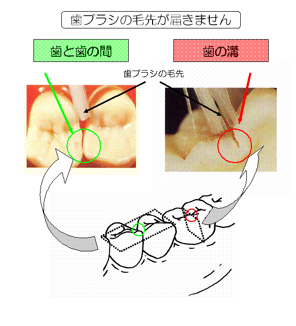 歯ブラシの毛先は、下の図のように歯と歯の間や歯の溝には届きません。きちんと磨いているのにむし歯が出来る原因の1つはこのためです。そうしたところは、むし歯菌の活躍するプラーク(歯垢)がたまり易く、また、もともと歯の質が弱くむし歯になりやすいところです。そのために、歯ブラシだけでむし歯を防ぐにはそもそも無理があるのです。