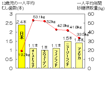 <甘味制限や代用甘味料の利用> 一般の健康志向の影響もあって、近年、砂糖(ショ糖)を含まない食品が販売されるようになり、また、キシリトールなどの代用甘味料も使用されるようになってきました。しかし、下の図のように日本の砂糖の摂取量は先進諸国よりかなり少ないのですが、むし歯の数(むし歯と治療した歯の合計数)は、とても多いのです。