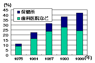 歯ブラシ法によるフッ化物歯面塗布 綿球法によるフッ化物歯面塗布 下図のように1999年では、フッ化物歯面塗布の経験者は、約40%であり、1歳6ヶ月児および3歳児健診や、その他の乳幼児健診の機会を利用して行うと、より多くの子どもたちに応用できます。