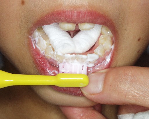 (5)1歳〜3歳未満児に対して家庭でのフッ素利用方法 泡状のフッ化物配合歯磨剤の塗布