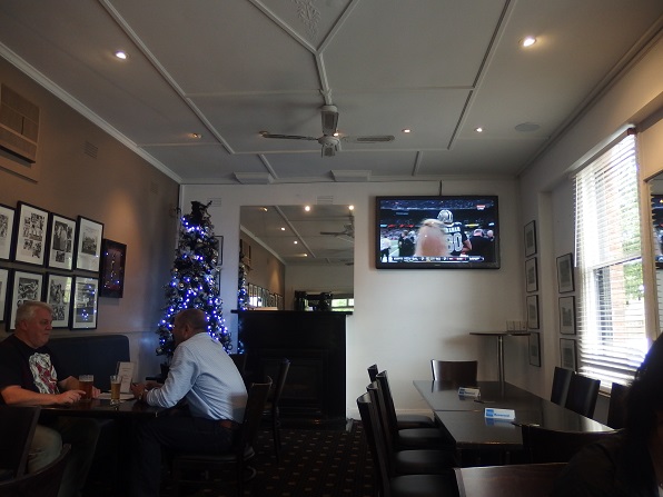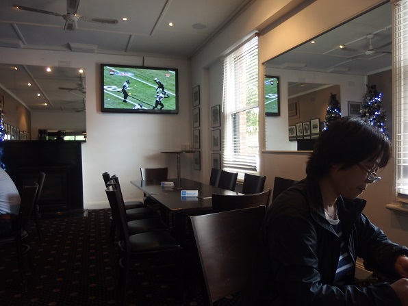 Emerald Hotelのスポーツバーが例会場らしく、ラグビーや、オーストラリアン・フットボールのチームの写真が一杯かざってあり、テレビはスポーツ中継だけでした。 |