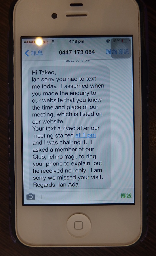| 今回のメルボルン研修旅行は、NPO法人日F会議の友人の晴佐久悟先生が、メルボルン大学に留学中で、大学訪問と水道水フロリデーション施設研修を目的に、訪問することになりました。 大学訪問・施設研修・大学での水質検査等の公式の仕事を終えた後の、最終日に、メルボルンのロータリークラブをメイクアップに訪問したくて、アクセスをしました。 国際ロータリー9800地区にある、メルボルン市内のロータリークラブで、例会を火曜日に開いているのは、2‐3ありましたが、丁度昼に開催している、メルボルン大学キャンパス内にある、Rotary Club of CarltonのHPに、旅行前から、メールで申し込みをしましたが、一向に返信がなく、晴佐久先生に依頼して、例会場の建物だけは場所を確認しておきました。 9月24日(月)公式行事のメルボルン大学訪問、浄水場訪問を終え、チャーターしたバスがメルボルン大学に到着して、午後5時過ぎ、今回の研修視察団の団長の山内皓央先生と、その友人で今回の旅行中、通訳としてお願いしていた董麗娟さん(RMIT大学日本語講師:北京出身)と小生の3人で、Rotary Club of Carltonの例会場を確認に訪問しました。火曜日の昼、午後1時から例会が行われている、メルボルン大学内の Graduate House には、入口にもロータリーのマークはなく、その建物の受付の女性に、董さんから聞いてもらいましたが、ロータリークラブの事は分からないと言われました。受付でPCのクラブのHPを確認してもらい、場所が確かにこの建物になっていることを認識してもらい、HPの連絡先に、董さんから、電話を入れてもらうも繋がらず、明朝までに連絡を下さいと、メールをしてもらいました。 さて、翌日、Rotary Club of Carltonから連絡がこないので、午後0時半から例会をしている、Rotary Club of Melbourne Southを、董さんの車で、山内先生と3人で訪問することにしました。市内中心部から、南の郊外に移動し、そのクラブの例会場のある、Emerald Hotel に正午頃、到着し、ホテルの女性に確認したら、「いつも、この部屋で開催される。もう少ししたら、会員が来られるから、待って下さい」と、その部屋で待たせてもらうことに。ところが、1時半過ぎても、誰も来られないし、2時近くになったので、その女性に董さんから尋ねてもらうと、知り合いの会員に連絡をして下さいました。それによると、Rotary Club of Melbourne Southでは、毎月第4火曜日は休会にしているとの事。また、そのクラブの事務所は、個人宅で、バナーの交換などを行うことはできないということで、代わりに、バナー交換などしてもらえるロータリーの事務所を紹介してもらいました。 また、董さんの車で、市内中心部へ戻りました。その事務所は、オプショナルツアーや、ポケット携帯Wi−Fiなどを扱っている旅行社のHISメルボルン支店の建物の隣にありました。メルボルンについた当日、宿泊のTune Hotel Melbourne から歩いて15分くらいの所にありました。その建物に入って、事務所の看板等を確かめると、確かにロータリーマークがあるRotary Club of Melbourneがありました。事務所を訪問すると、Office ManagerのMs.Jo Marrosさんが出迎えて下さいました。日本から持っていった東となみロータリークラブのバナーと、メルボルンロータリークラブのバナーを交換して頂きました。このクラブは、大阪RCと姉妹クラブで、彼女自身も日本を訪問したことがあり、ほんの少し前に岐阜城にも行ったそうです。もう少ししたら、2014-2015年度会長のMr. Peter D Bearsleyさんが来られると言われ、待たせて頂くことに。しばらくして、恒例のロータリアンが来られ、挨拶をされました。彼は、1993-1994年度会長のMr. Gerry Johnston さんでした。そのあと、もう一人の会員の方(スミマセン!名刺を交換しませんでした)が来られ、小生のメルボルン訪問の理由を聞かれ、メルボルン大学の知人を訪問して、WF(Water Fluoridation)について、勉強すると答えました。すると、彼は自分はメルボルン大学の出身で専攻は化学ということで、現在は水道関係の仕事をしているということで、豪州は、水道水フロリデーションで国民のむし歯予防に貢献している、メルボルンのあるヴィクトリア州は90%くらい実施しているが、ブリスベーンのあるクイーンズランド州はまだ50%くらいだ、はとも話されました。自分のクラブの歯科医の会員を紹介して、WFを教えてあげようと言われました。それについては、メルボルン大学で講義を受けてきたし、浄水場も訪問してきたし、講義では、最新の情報としてクイーンズランド州では現在は80%くらいが実施しているそうです、と答えたら、君の方が詳しいねと、言われました。それから、日本で、まだ実施していないというと、自分たちの姉妹クラブの大阪RCで啓蒙したらどうだと言われました。もし行くなら、当クラブの紹介状を出すとまで言われました。大変、熱心な好意を頂いて、豪州で一番古いロータリークラブを後にしました。 その後、山内先生、通訳の董さんと、レスト