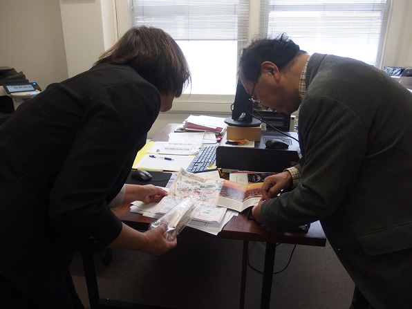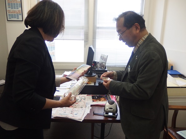 ![]() 持参した、富山県、南砺市、砺波市の英語のパンフレットを説明 |