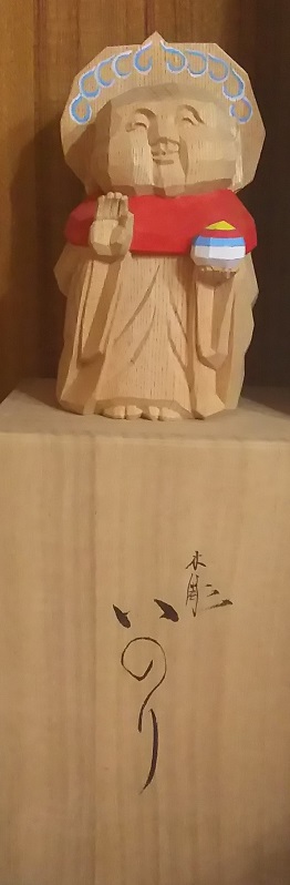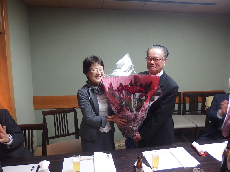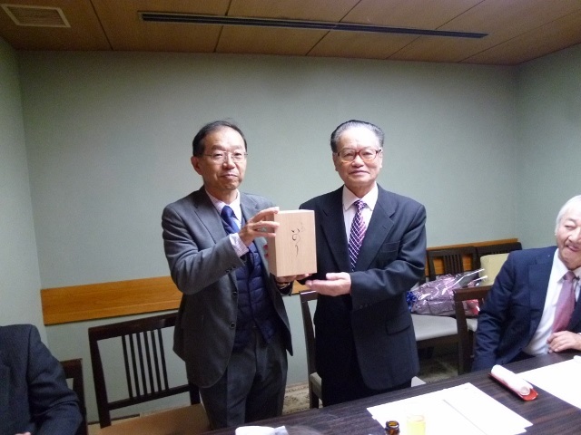 境脩先生の慰労会の参加者は、日F役員、元役員など有志、26名。 黒瀬真由美理事から、はるばる岡山から新幹線で運ばれた、花束の贈呈。 記念品は、富山、南砺(井波)の伝統工芸品、木彫作品です。(もちろん、小生が選びました) 将来にわたって、「水道水フロリデーション実現への祷り」を、道端のお地蔵さんにも、願ってもらいます。