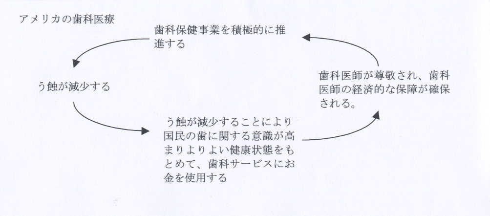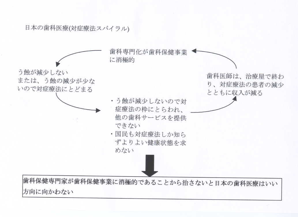 水道水フッ化物濃度適正化を支援・実施していくのにリーダーシップを取るのは歯科医師であり、それを実行することによって高い尊敬を得られる。また、う蝕が減少することにより国民の口腔保健への期待が高まり国民はよりよい健康状態をもとめて歯科サービスにお金を使い、歯科医師の収入が増加するという良い循環になっているようです。それと比較して日本は、歯科保健対策を歯科医師が積極的にしない→う蝕が減らない→対症療法しかしない(削ることしかしない)→国民の尊敬、収入を得られないという悪循環に至っているようです。「対症療法スパイラル」とでもいうのでしょうか。 アメリカの歯科医療
