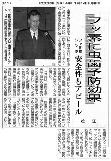 島根県のフッ化物応用シンポジウムに参加して 福岡歯科大学 晴佐久 悟 平成14年1月13日(日)に開催された島根県のフッ化物応用シンポジウムには、島根県の関係者をはじめ他県からも多数来られていました。今回のシンポジウムに来られなかった方のためにポイントを絞ってご紹介したいと思います。 1.基調講演 「公共施策における水道水フッ化物濃度適正化事業」と題してアメリカ国立疾病対策センター口腔保健部長であるウィリアム・マス先生が講演をされました。フッ化物のう蝕予防メカニズム、水道水フッ化物濃度適正化の費用・効果・安全性を解説されました。その中で特に印象に残ったのがありましたので簡単に紹介したいと思います。