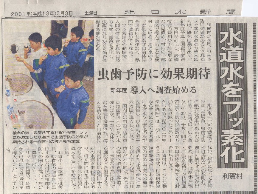利賀村は,こうした動きに合わせ,村歯科保健推進協議会に加わる歯科医の勧めで研究への着手を決めた。来月、研究に取り組んでいる埼玉県吉川市などと合同で,先進地の韓国へ調査団を派遣。フッ素を水道水に添加する施設などを視察する。