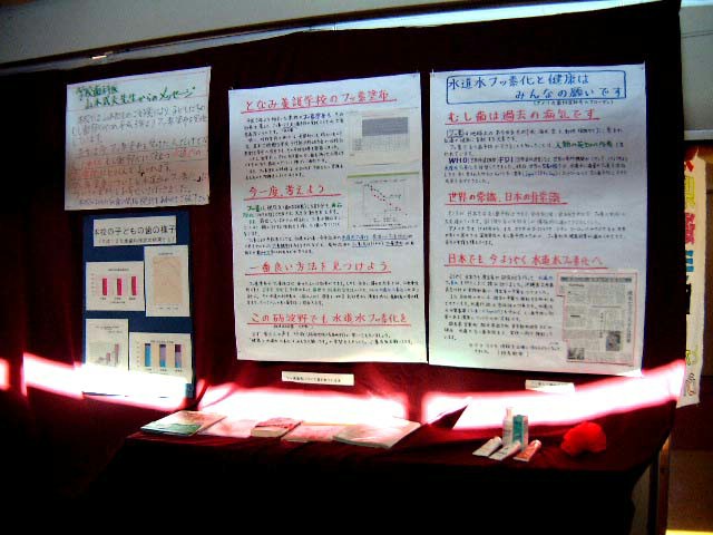 平成12年度の文化祭に,保健関係の展示に合わせ、「水道水フッ素化と健康はみんなの願いです」の,展示を行いました。11月5日,むし歯予防全国大会と重なったため,当日は説明などできませんでした。 しかし,大変良かったと感想を頂きました。学校保健委員会などでも,話し合って行きたいと思います。周囲の市町村に対して,理解を求める要望や請願につながればと思います。 |