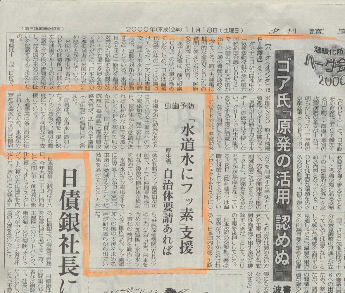 | 11月17日の衆議院厚生委員会の質問事項に「水道水フッ素化」があがったことは,日本の国もようやく,歯科保健鎖国時代を抜け出そうとしている兆候である。 くしくも,この記事を取り上げた読売新聞が,昨年,社説でこれを取り上げ、すべて,マスコミの先鞭を切ったのが,一連の鎖国時代終焉への道のりの一歩であった。 読売新聞の馬場錬成編集委員が木戸孝允としたら、惜しくも志半ばで急逝された故山下文夫先生はまさに坂本竜馬。 平成維新の,夜明け間近の様相を呈する,衆議院厚生委員会のやり取りであった。自由党の武山議員が,さらに,国民のために,厚生省の進んだ健康施策を引き出させるよう、期待するものである。 |